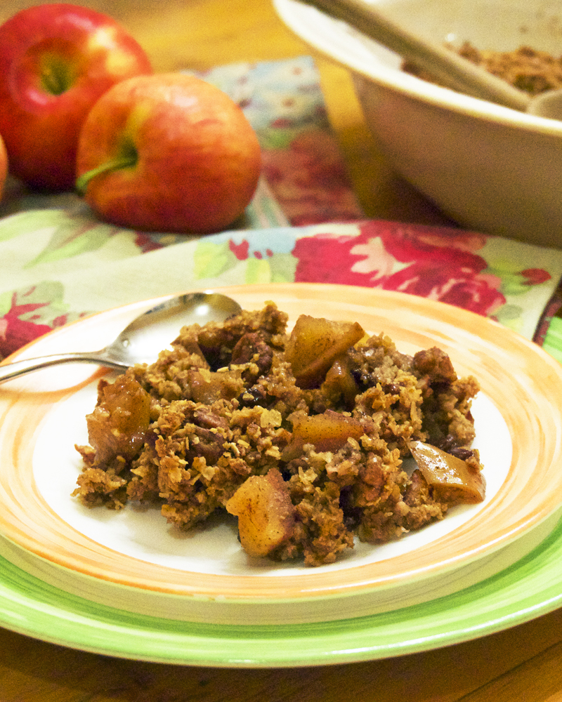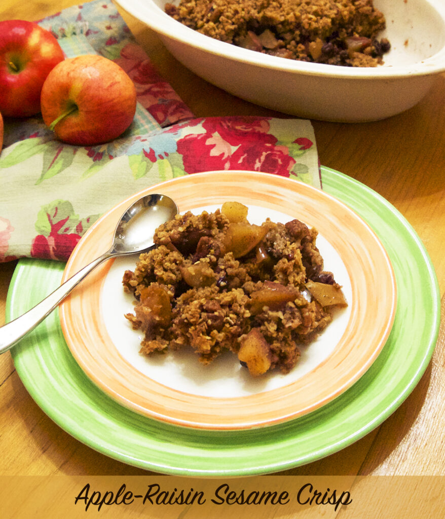 Here’s a snazzy vegan fruit crisp that can be prepared any time of year. Apples and cinnamon are combined with plump raisins, then topped with a crispy pecan and tahini topping to present a delightful treat to serve for breakfast, afternoon snack or sweet dessert.