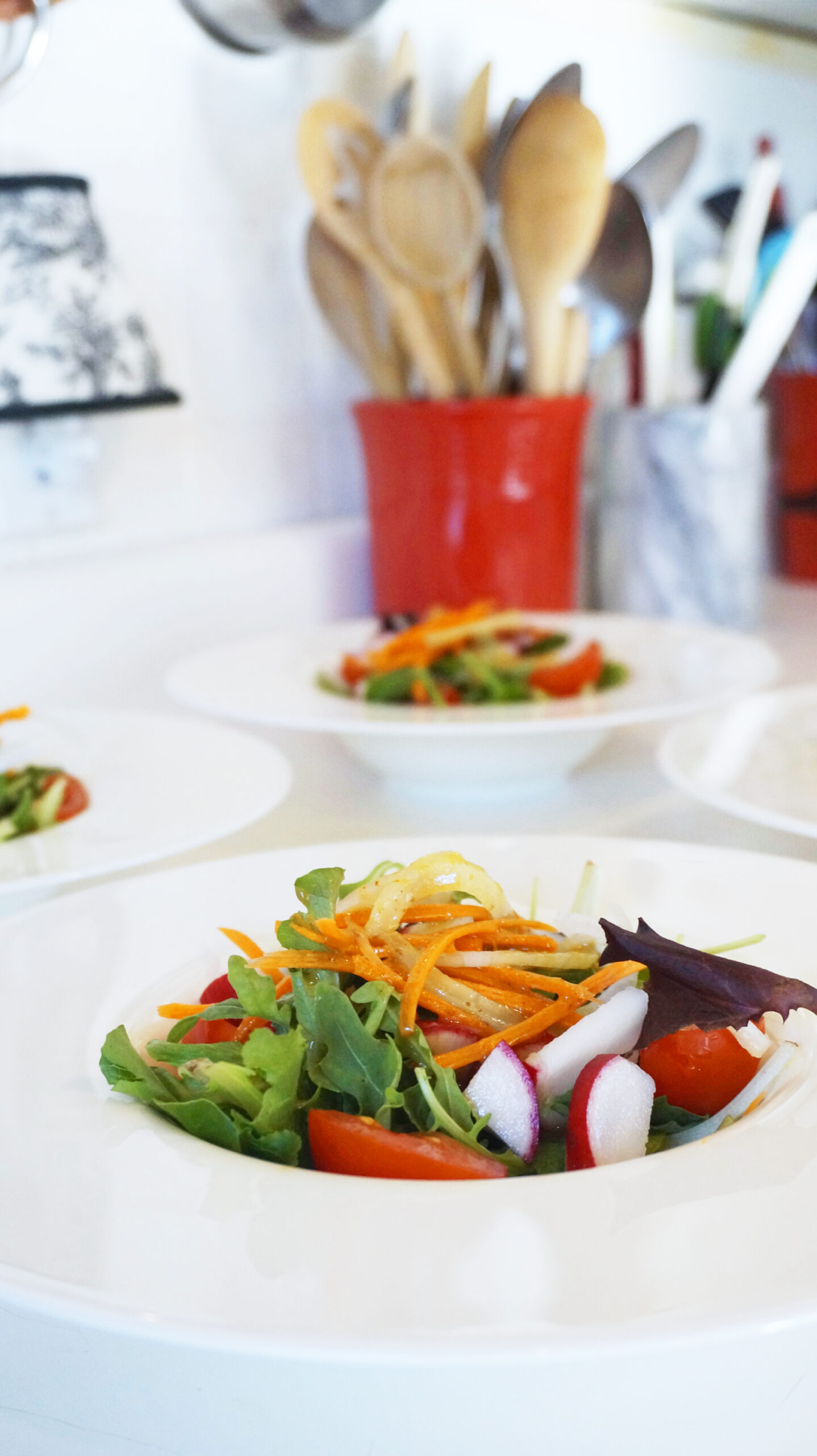 Put one-quarter of the baby spring greens into each of four salad bowls. Arrange 4 tomato quarters (or 4 grape tomatoes) around the perimeter of each bowl. Scatter one-quarter of the radish slices and one-quarter of the onion slices over the greens. Put the carrots in a little mound over the top of the greens, in the center of the salad.