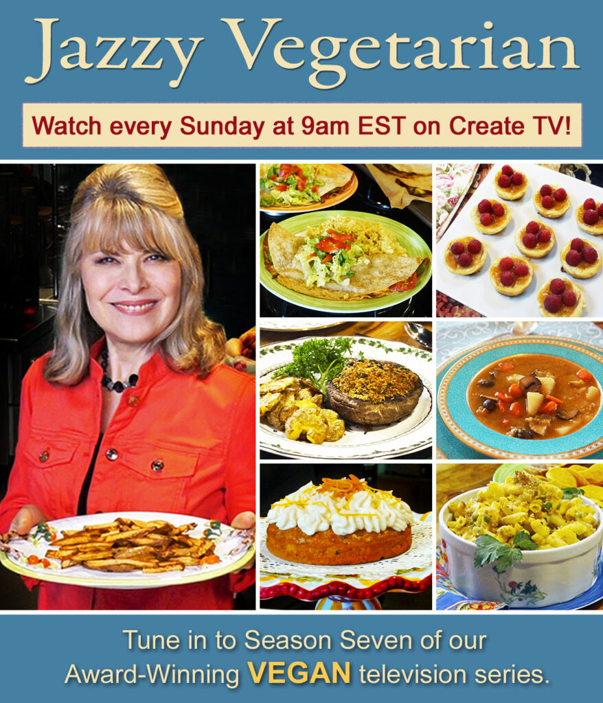 Woo hoo! You can now watch Jazzy Vegetarian on the Create Channel, Sunday mornings at 9am EST! Jazzy Vegetarian is the hit, long-running, vegan cooking show featuring Taste award-winning vegan chef, cookbook author, and host Laura Theodore. Each week, Laura prepares easy and delicious plant-based recipes, served up with some fun music on the side. All recipes are 100% vegan. (Check your local listings HERE and tune in!)