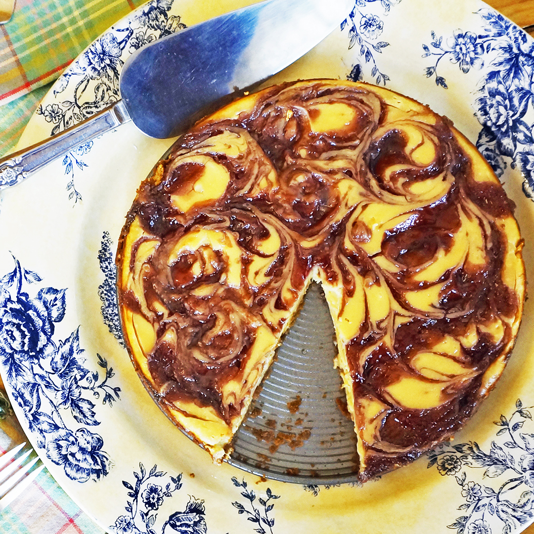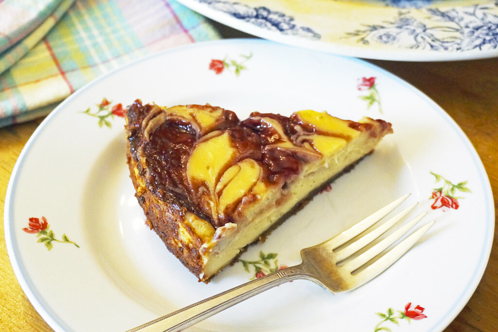 To make the raspberry swirl, put the raspberry jam or preserves and water into a small bowl and vigorously stir to combine. Carefully spoon long, thin lines of the raspberry jam mixture over the top of the vegan cheesecake, about 5 to 6 “lines” in all. Then, using a wooden skewer, or the tip of a knife, gently swirl the raspberry jam into the top of the cheesecake in a pleasing, marbleized pattern. Put the vegan cheesecake on a rectangular sheet pan (to catch any drips) and bake for 35 to 45 minutes, or until the center is almost firm to the touch. (The raspberry filling will be very soft at this point, but it will firm up once the cheesecake chills in the refrigerator).