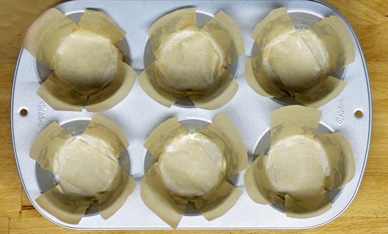 Preheat the oven to 375 degrees F. Lightly coat a 6-cup jumbo muffin tin with vegan buttery spread (see note). Line each cup with two, 2- by 7-inch parchment paper strips.