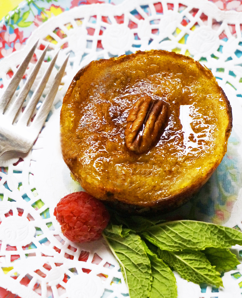 Put the pan on a wire rack and gently run a knife around the perimeter of each mini pie. Put the remaining 2 tablespoons maple syrup into a small bowl. Top each little pie with 1 pecan half and, using a pastry brush or small spoon, spread some maple syrup over the top of each sweet potato pie. Let cool 30 minutes.