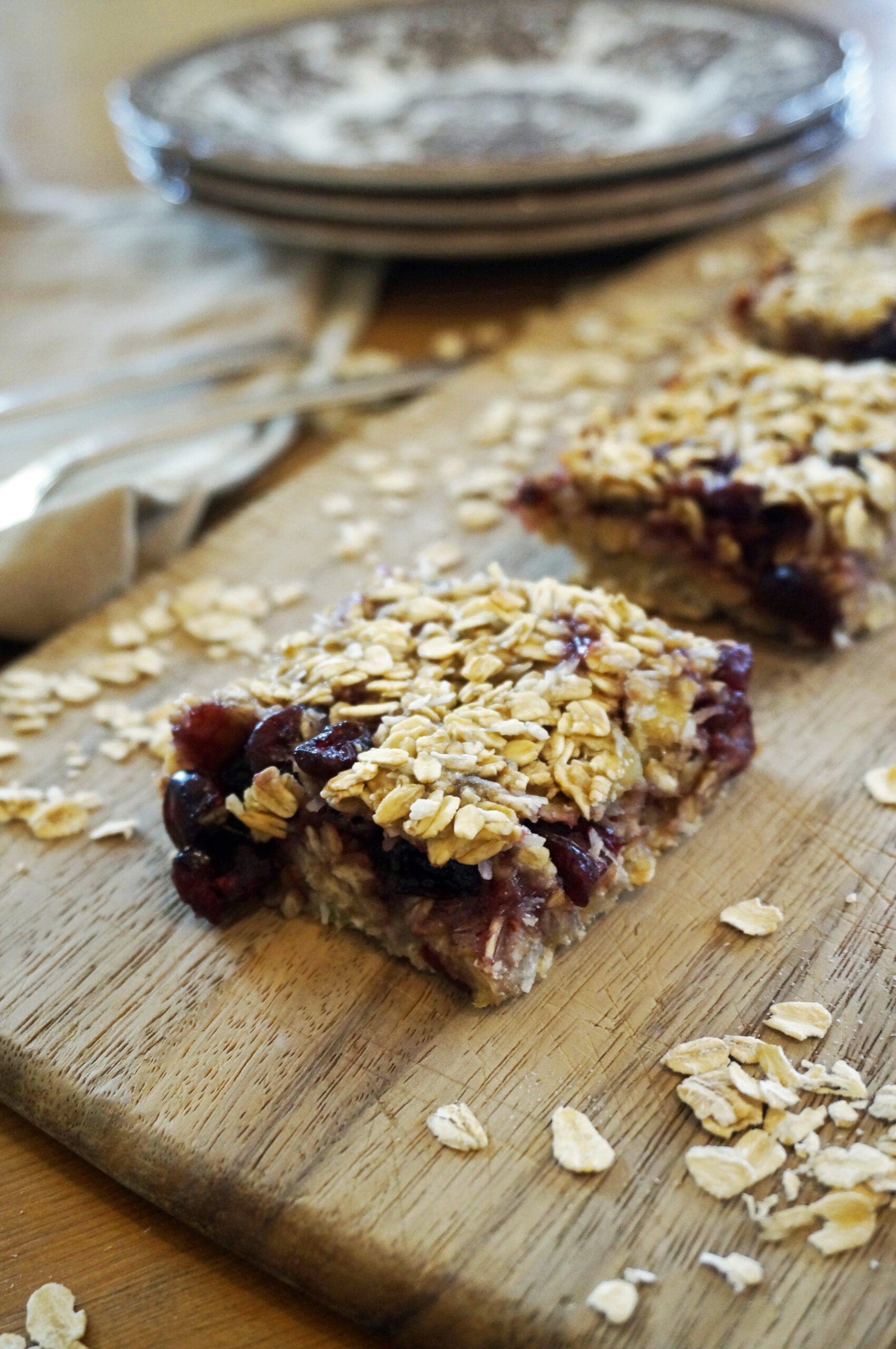 Preheat the oven to 375 degrees F. Line the bottom of an 8-inch square rimmed baking pan with unbleached parchment paper, leaving an overhang of 2-inch “wings” on two sides of the pan. Put the bananas and maple syrup in a large bowl and mash into a chunky purée using a potato masher or large fork. Stir in the oats, cranberries and coconut.