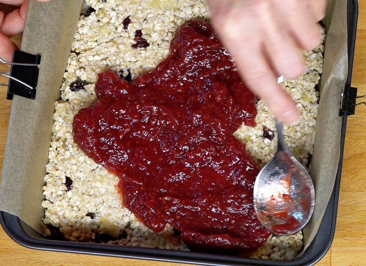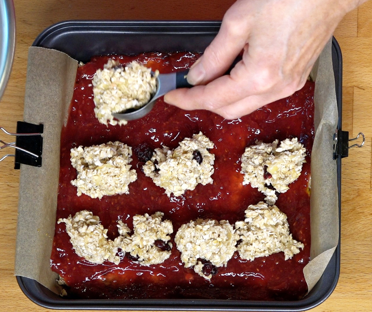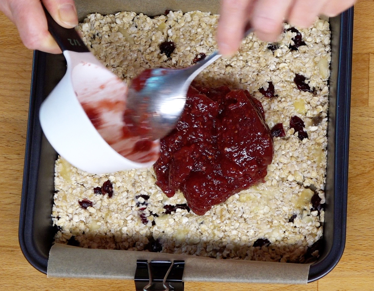 Spread half of the oat mixture in an even layer in the prepared pan. Spread the raspberry preserves in an even layer over the oat mixture. Spread the remaining oat mixture in an even layer over the preserves. Bake for 25 to 35 minutes, or until slightly golden. Put the pan on a wire rack and let cool 3 to 5 minutes. Using the paper "wings" carefully lift the squares out of the pan, and set them on the wire rack. Let cool 15 minutes.
