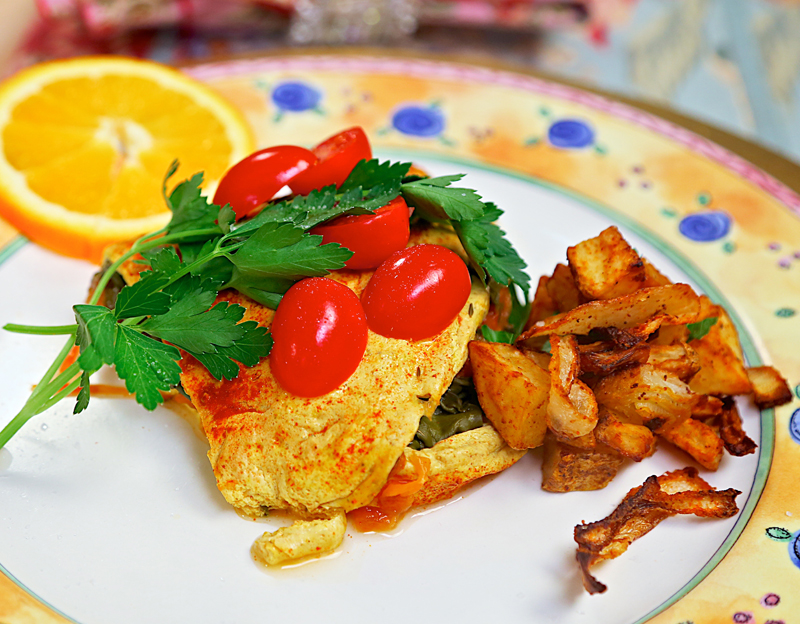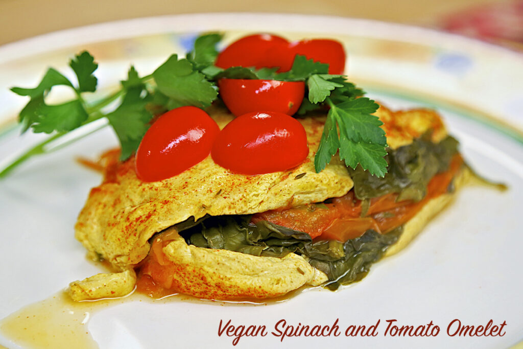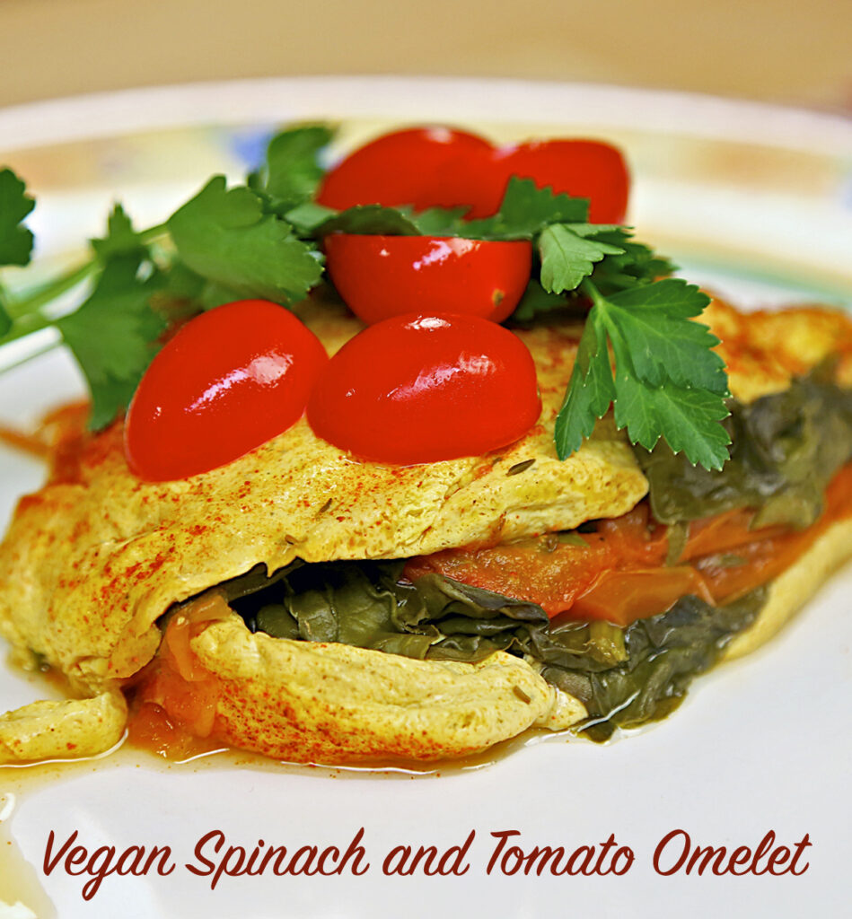 I tried for years to create a tasty vegan omelet, so I was super excited when I came up with this oven-baked Spinach-Tomato Vegan Omelet. Because a tofu-based omelet is more delicate than the classic egg version, I have developed a jazzy method for helping it to stay together when serving. It takes a little bit of extra fuss, but is well worth the effort.
